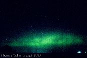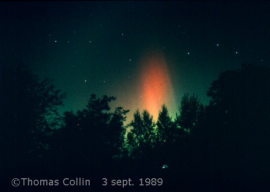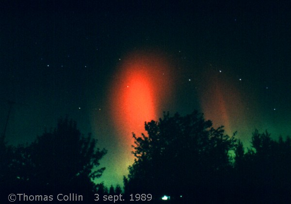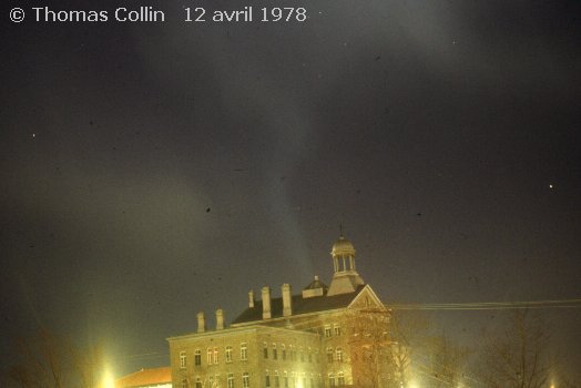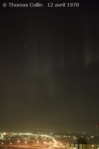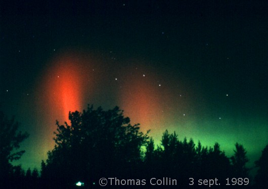 Aurores causée par un orage magnétique qui a aussi été responsable d'une panne d'électricité à la grandeur du Québec. Photo prise à Trois-Rivières-Ouest, le 13 mars 1989.