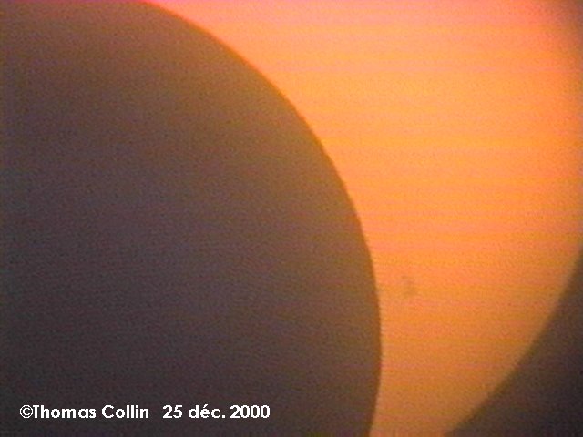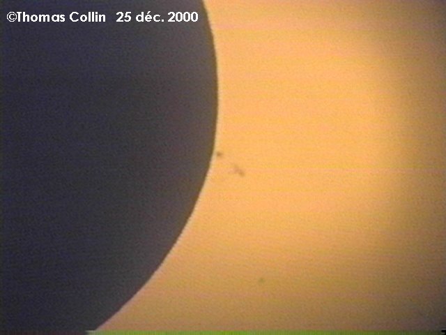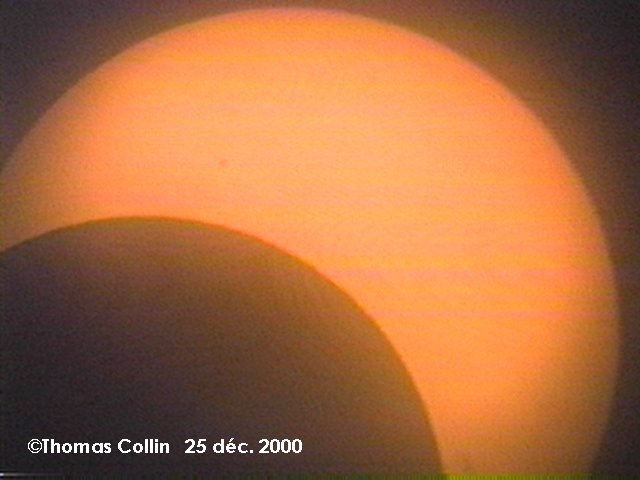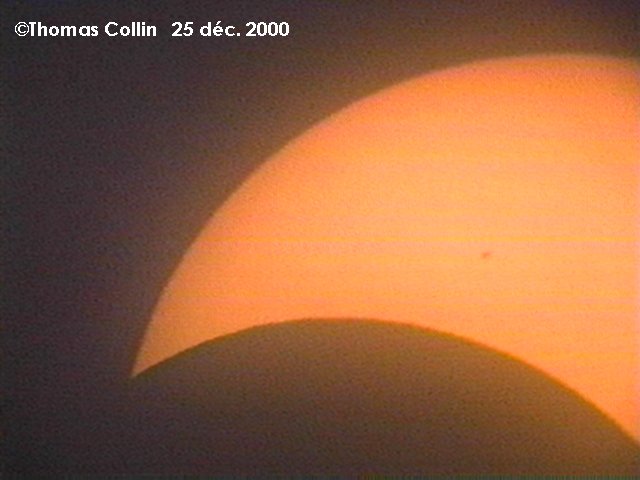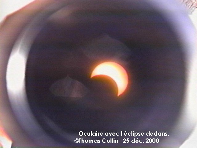 Voici mes photos de l'éclipse de Noël, la dernière du millénaire. Toute ces photos proviennent d'un vidéo pris à l'oculaire de mon télescope de 4,25" f4,7. J'avais mis un filtre de Thousand Oaks en avant du télescope.