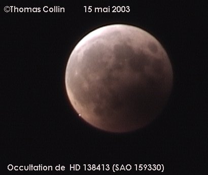 Ces photos ont été prises avec une caméra vidéo numérique avec un zoom optique de 25X. Cliquez ici pour voir un vidéo de l'occultation de l'étoile HD 138413.