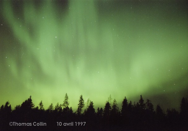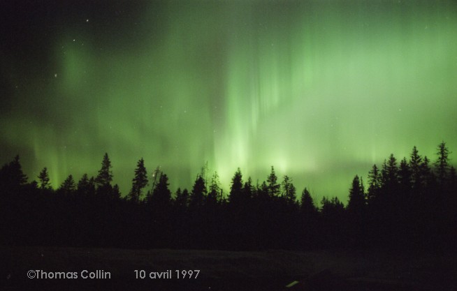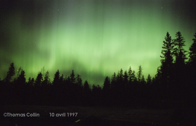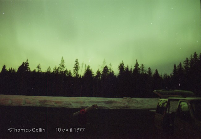 Aurores du 10 avril 1997. La comète Hale-Bopp est faiblement visible sur les premières photos. Photos prises au parc national de la Mauricie.